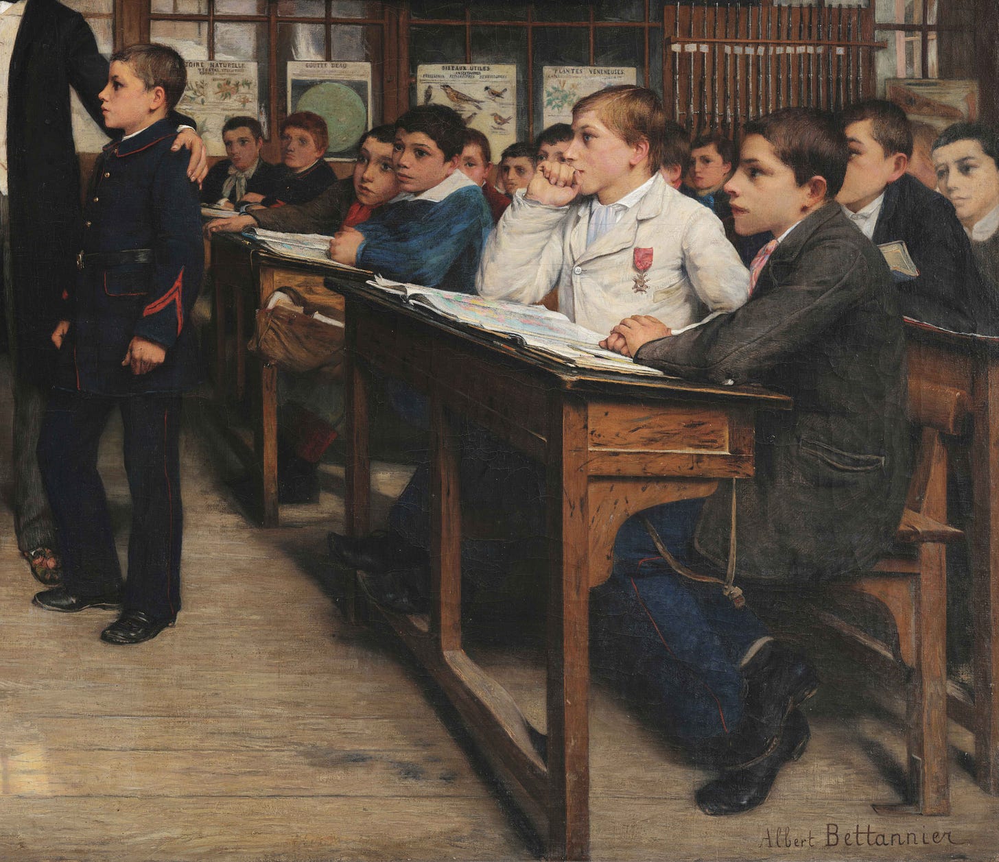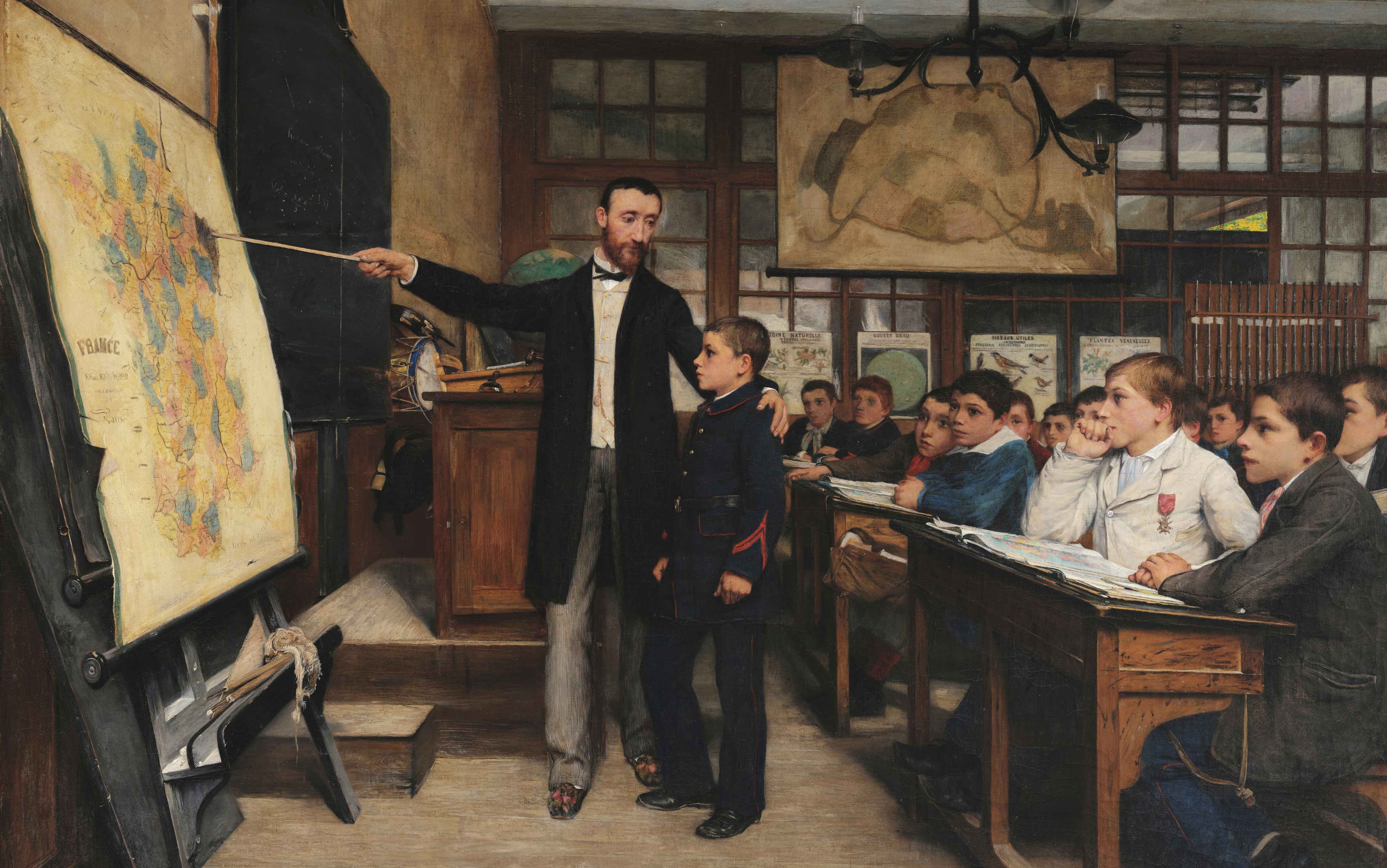 Volviendo al lienzo, en esta aula situada probablemente en París (fíjate en el mapa del fondo, que muestra los límites administrativos de la capital francesa), un profesor muestra las «provincias perdidas» en un mapa de Francia a un alumno mientras sus compañeros escuchan atentos.