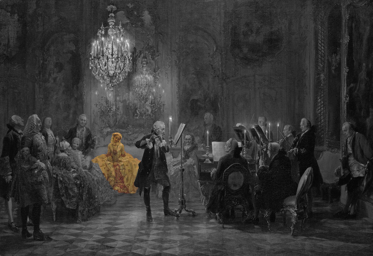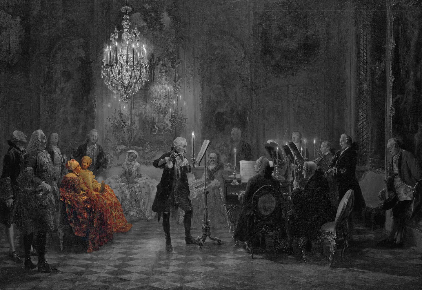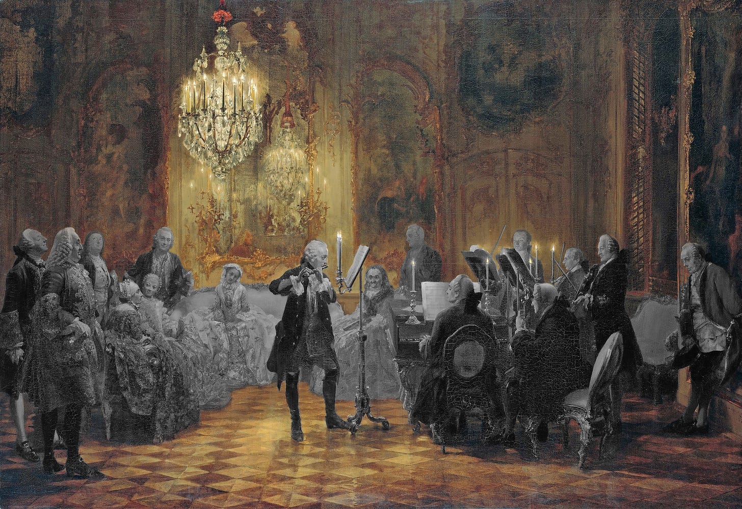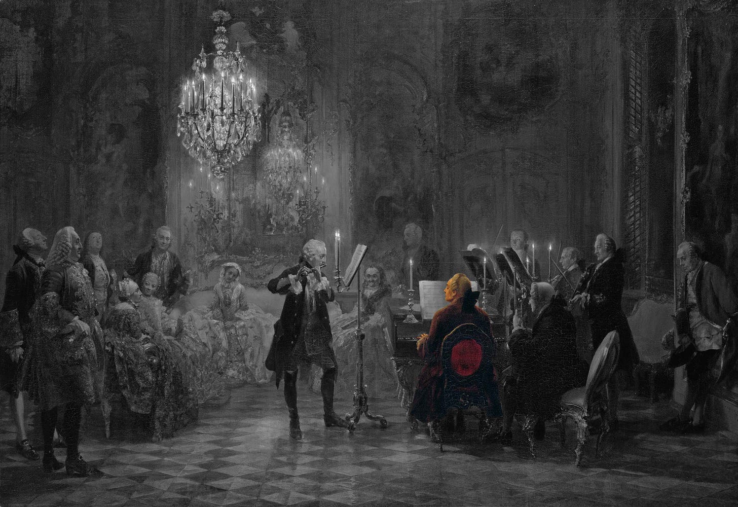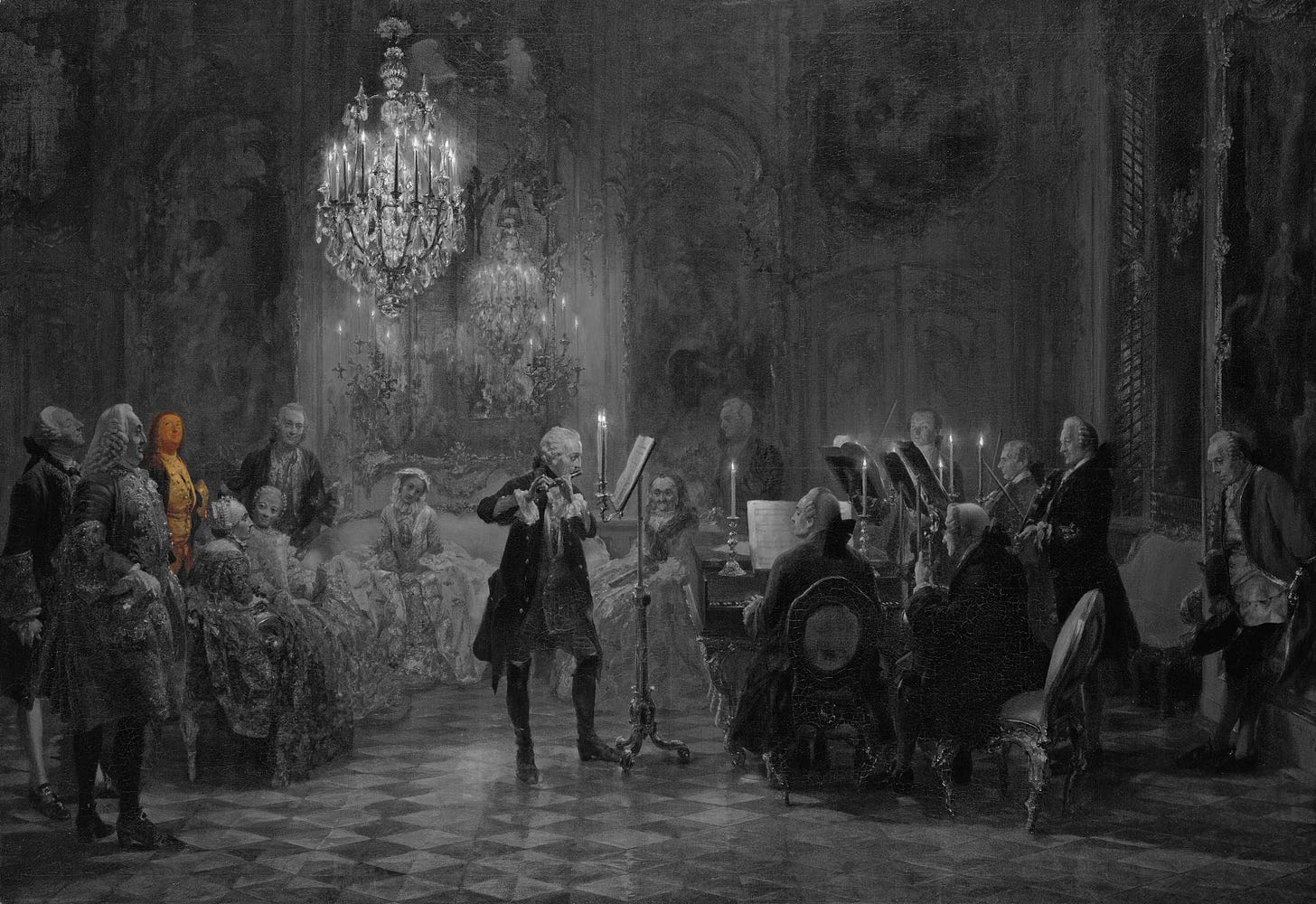 En el centro aparece la figura idealizada de Federico II de Prusia: el primer músico amateur del reino. La figura del rey se destaca no solo por su posición central y su iluminación, sino también por el tratamiento compositivo que lo separa ópticamente del resto de los intérpretes mediante el atril alto y el espacio vacío a su alrededor.