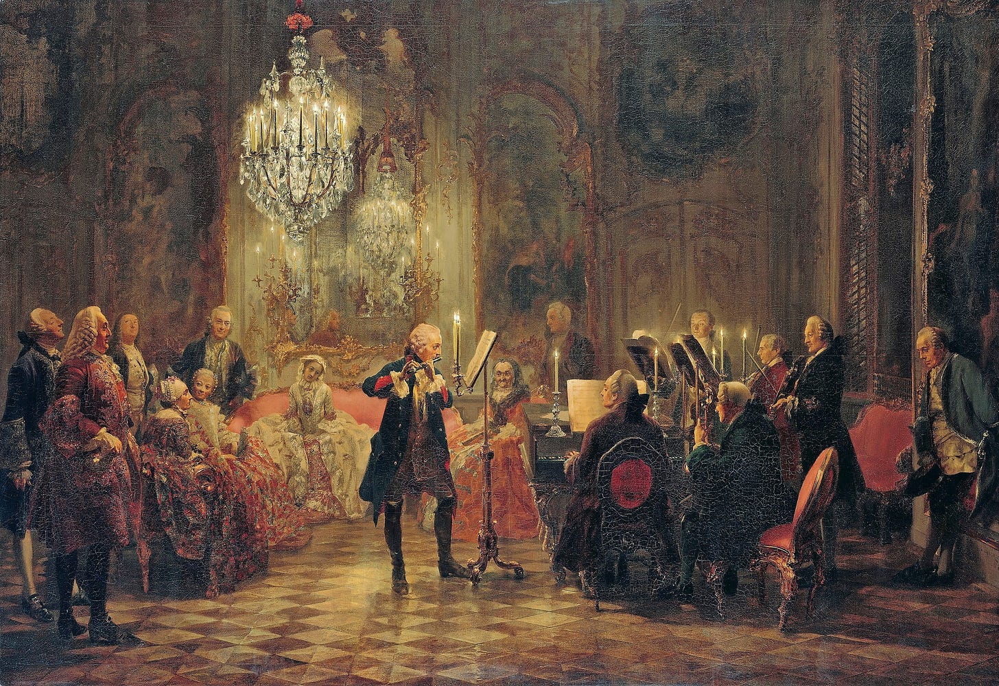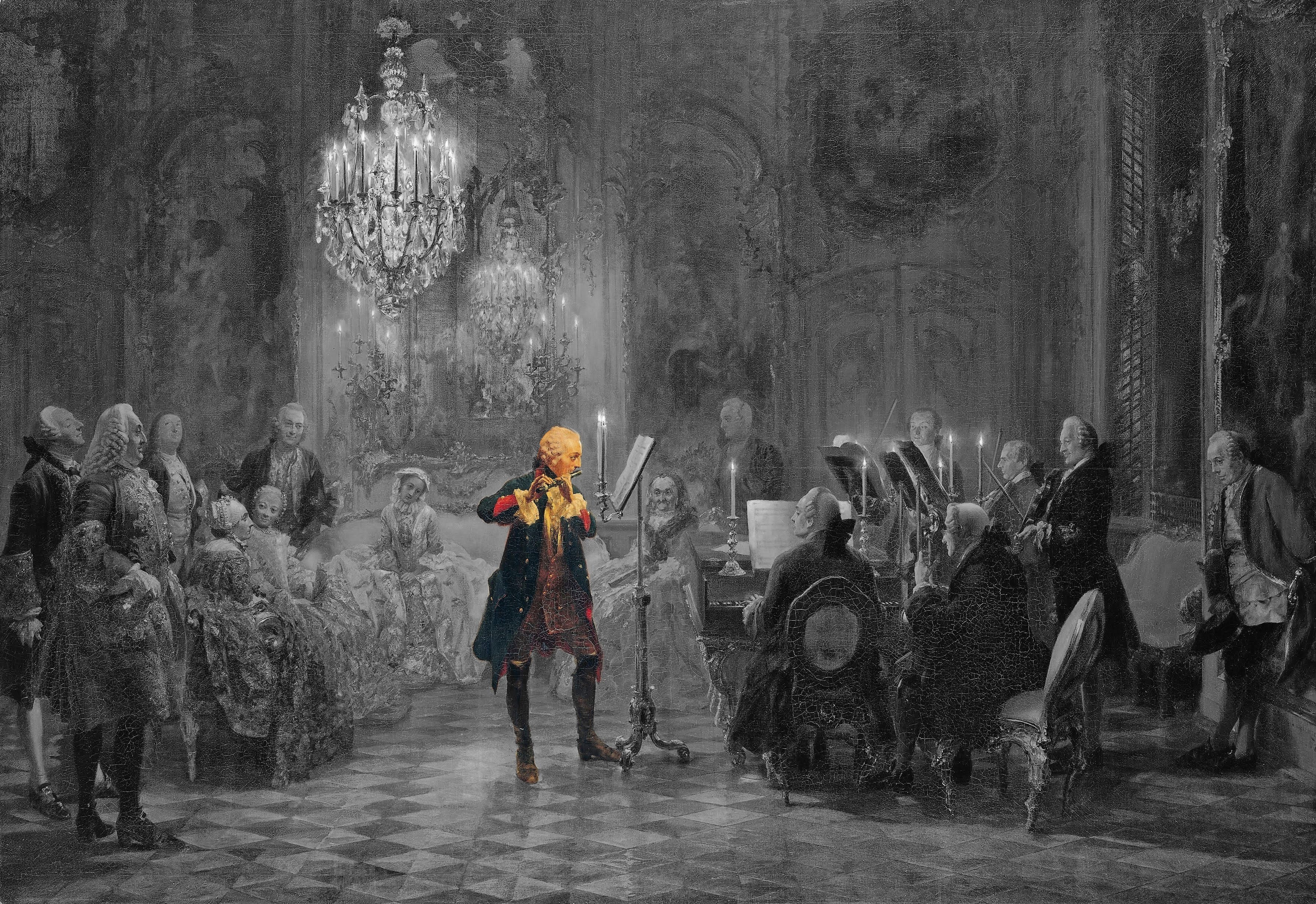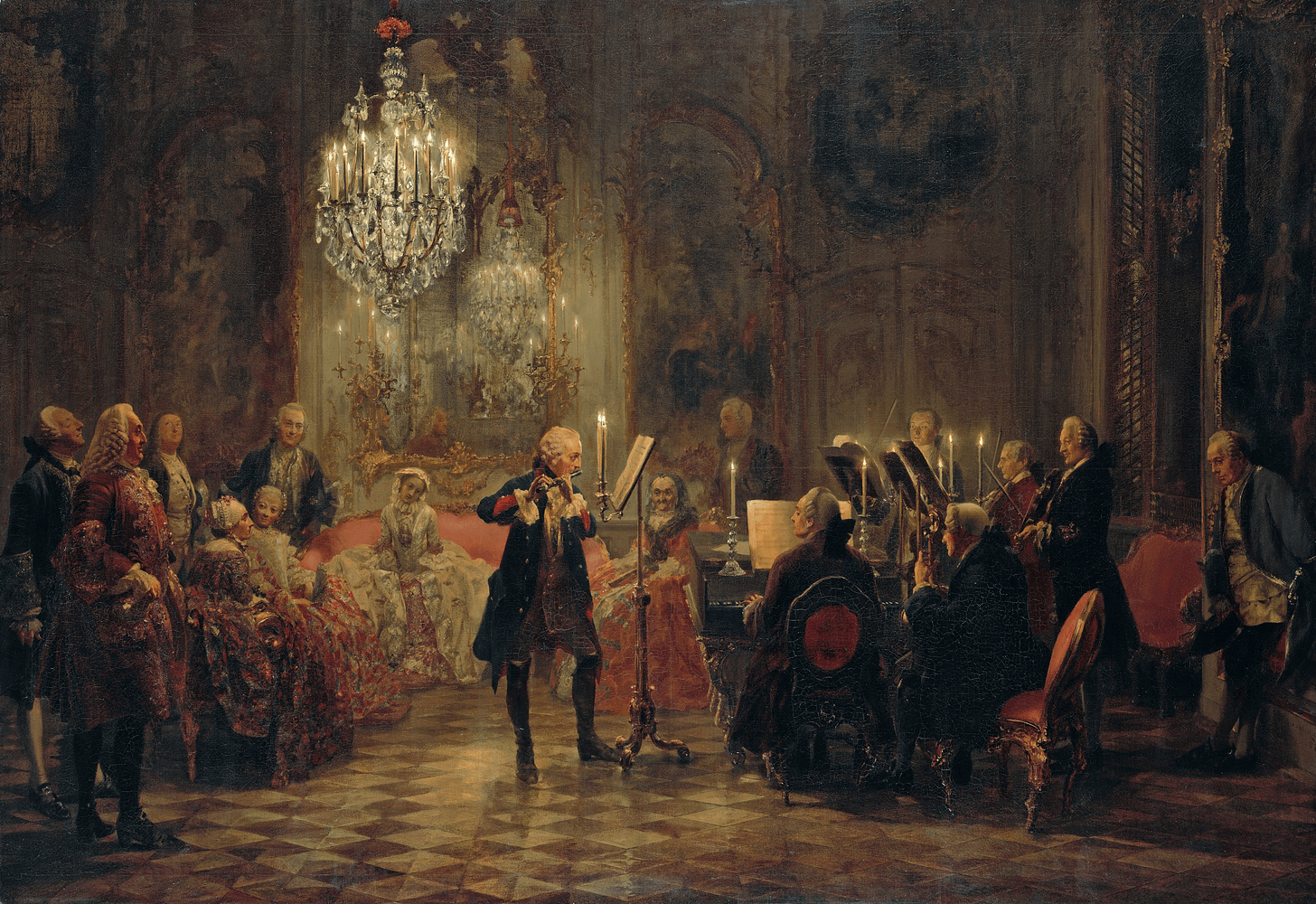Este óleo sobre lienzo representa un momento íntimo en la corte de Federico II de Prusia, donde el monarca, amante de la música, interpreta una pieza con su flauta frente a un reducido círculo de músicos, familiares e intelectuales. Veamos quiénes son uno por uno.