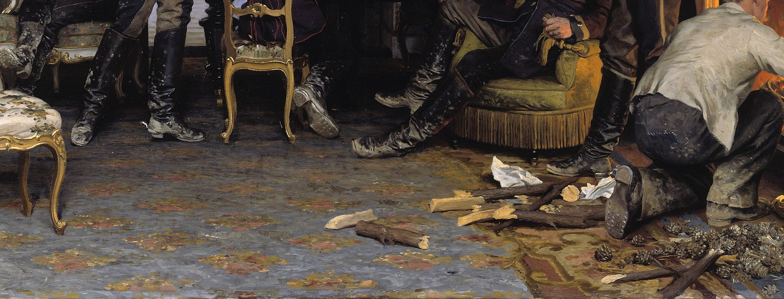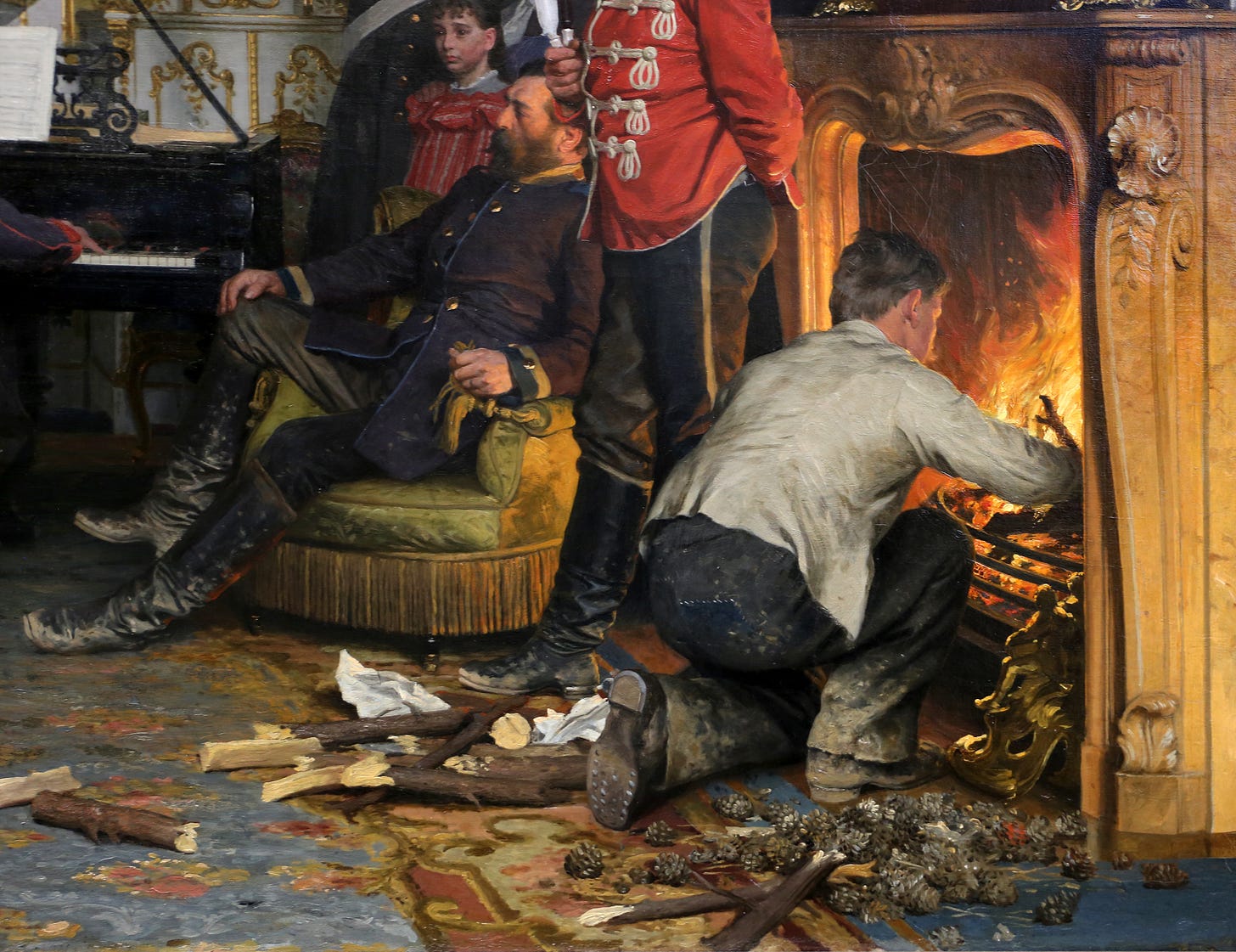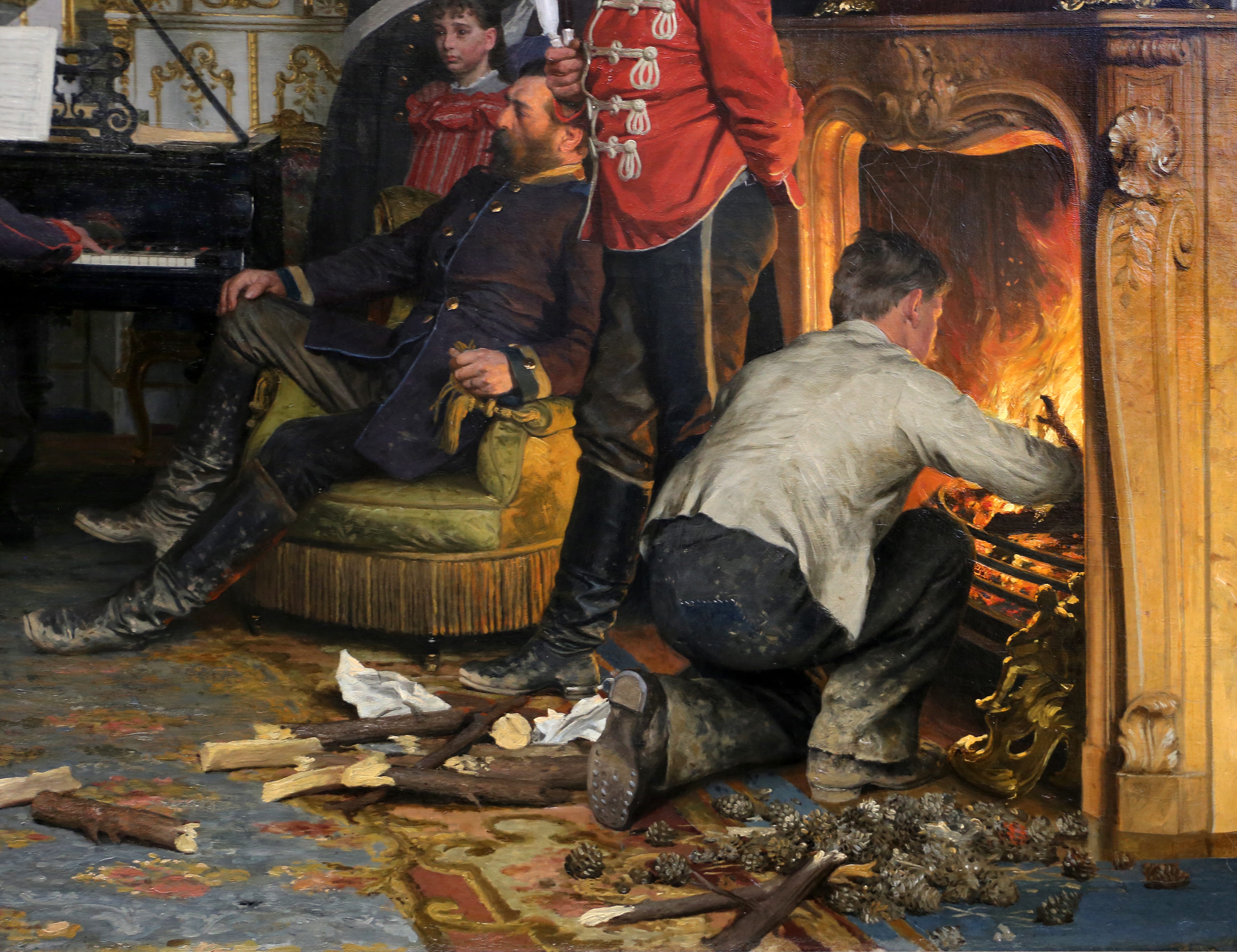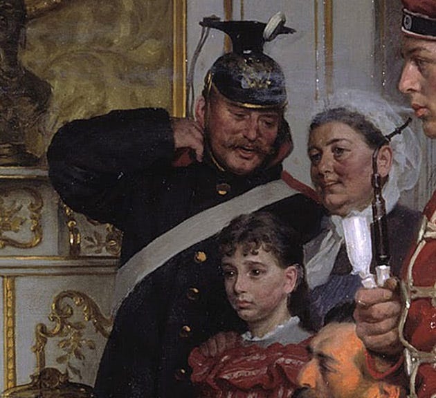 Pero toda esta cuidadosa escenificación con fines propagandísticos se derrumba tras echarle un segundo vistazo a este gran elefante en la habitación. Fíjate en el contraste de todas esas botas llenas de barro sobre la maravillosa alfombra de la estancia. La discrepancia entre el distinguido interior del Segundo Imperio y el rudo aspecto de los soldados, que también afecta a su pretendida producción musical de alto nivel, arruina involuntariamente la intención del pintor y recalca el refinamiento cultural del Segundo Imperio Francés frente a la fuerza bruta de sus vecinos alemanes, como si de una moderna rivalidad entre atenienses y espartanos se tratase. Asimismo, llama la atención la expresión risueña de la portera, que seguramente será la pringada que deberá sacar como sea toda esa suciedad de las alfombras del palacete con gran esfuerzo. Quizá la expresión facial de su hija refleje mejor los sentimientos de alguien que se ve ante la incómoda presencia de soldados invasores que te complican la existencia y te hacen trabajar mucho más de la cuenta.