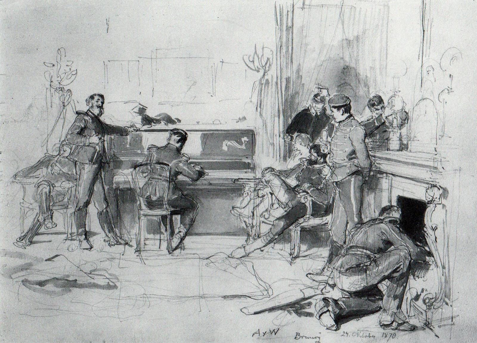 Anton von Werner y la Comisión Estatal de Arte eran conscientes de la popularidad del género bélico. El mero hecho de que este tipo de pintura patriótica hubiera alcanzado tal popularidad en la década de 1890 puede indicar que, a finales de siglo, el chovinismo alemán tan vehementemente criticado por Friedrich Nietzsche después de 1871 había evolucionado hacia algo que era, si no más generoso con el victimismo francés o indulgente con la brutalidad alemana, al menos más inocuo. Resulta revelador que, cuando los espectadores de la época comentaron la representación de Werner de soldados descansando irrespetuosamente sobre el refinado mobiliario de un hermoso chateau francés, encontraron este aspecto divertido, no ofensivo, puesto que un reflejo de su cultura nativa brilla a través de la música.