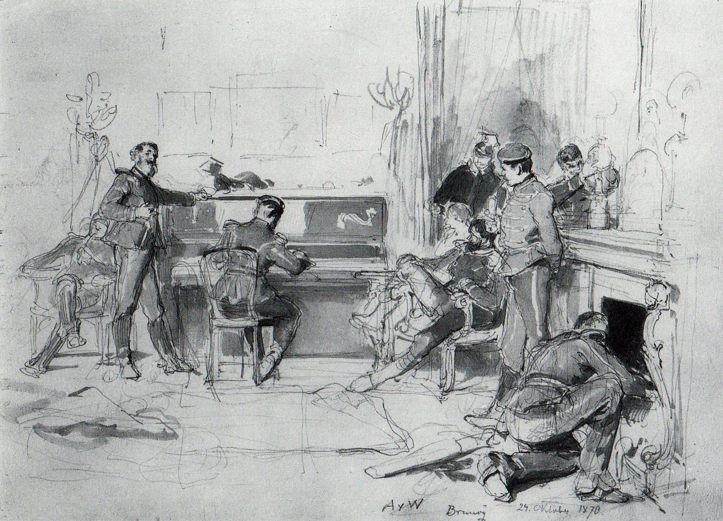 Los soldados alemanes, pese a su aspecto desaliñado y sucio por los rigores de la campaña, no se nos presentan necesariamente como rudos o brutos. Al contrario: unos simples oficiales del ejército prusiano son capaces de interpretar música clásica con suficiente destreza como para atraer a la portera francesa, que los escucha risueña junto a su hija bajo la mirada cómplice de otro de los soldados. Según las notas del pintor, cantan la versión de Franz Schubert del poema de Heine «Das Meer erglänzte weit hinaus» (El mar brilla resplandeciente en la distancia), que era muy popular entre todas las bandas militares de la época. Puedes escucharla reproduciendo el vídeo que incluimos a continuación: