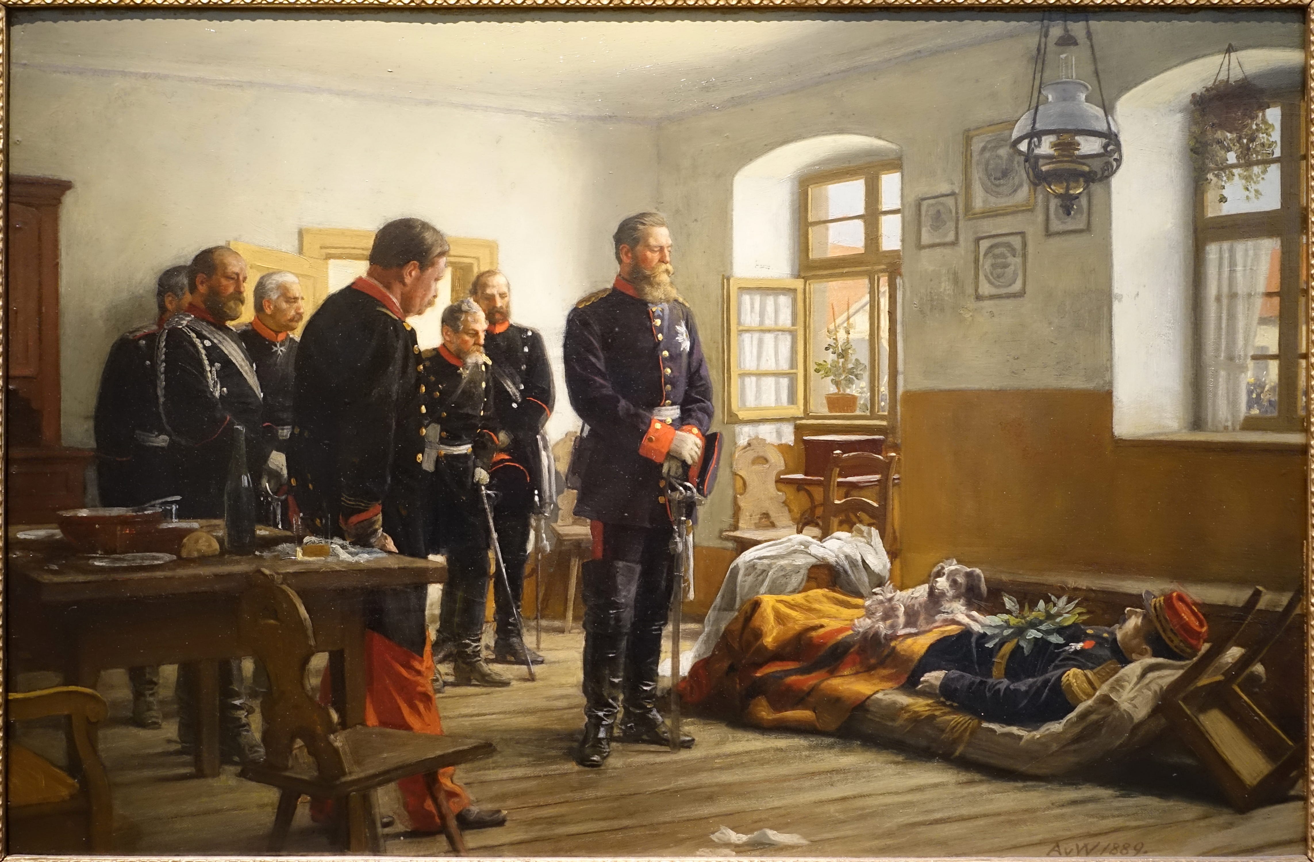 Un pintor alemán invadió Francia en 1870. No lo hizo en solitario ni como soldado (había sido declarado no apto para el servicio), sino que acompañó al estado mayor de uno de los ejércitos que pusieron de rodillas al ejército galo durante la Guerra franco-prusiana de 1870-71, para ser más precisos el Tercer Ejército, comandado por el mismísimo príncipe heredero Federico. Su propósito era reunir material para un cuadro que le habían encargado, pero en el proceso nuestro artista también logró establecer una relación de amistad con el futuro rey de Prusia y emperador alemán (lo que le abriría las puertas a los salones de las élites políticas y militares del Segundo Imperio Alemán), y experimentar en carne propia la fase final de la guerra, un tema frecuente en su producción artística posterior como este ejemplo: el príncipe heredero, Federico, rindiendo un solemne homenaje al general francés Abel Douay, caído heroicamente en combate el 4 de agosto de 1870 contra las tropas del aristócrata alemán.